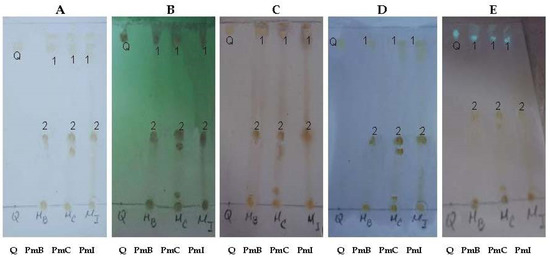 Chemical profile by TLC of extracts from Phania matricarioides collected from different geographical localities in Cuba. Quercetin was used as control. Aluminum-backed silica gel TLC plates. Mobile phase: n-butanol:acetic acid:water (65:25:10, v/v/v). (A): Visible; (B): UV 254 nm; (C): H2SO4/heat; (D): aluminum chloride 5%; (E): UV 365 nm; Q: quercetin; PmB: collected in Bauta, Artemisa Province, Cuba; PmC: collected in Cangrejeras, Artemisa Province, Cuba; PmI: collected in gardens of the Faculty of Pharmacy and Foods, La Lisa, Havana Province, Cuba.