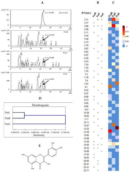 The profile obtained by HPLC showed qualitative and quantitative differences (Figure 6A). A total of 19, 20 and 15 peaks with a relative abundance according to the AUCs of 0.38–20.11%, 0.12–19.53% and 0.69–30.33% for PmB, PmC and PmI, respectively, was obtained. A general overview of the qualitative (Figure 6B) and quantitative (Figure 6C) compositions can also be visualized in the map. Among extracts, PmB and PmI resulted in closer chemical characteristics and constitute a cluster according to the obtained similarity dendrogram (Figure 6D). The results revealed that the flavonoid quercetin (Figure 6A,E) was identified in all the samples by comparison of its retention time and UV spectrum, although higher quantities were detected in the PmC extract (Figure 6C).