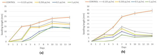 (a) P. oleracea and (b) E. crus-galli seedling growth with peppermint essential oil. Control and treated with peppermint essential oil at 0.125, 0.25, 0.50, and 1 µL/mL.