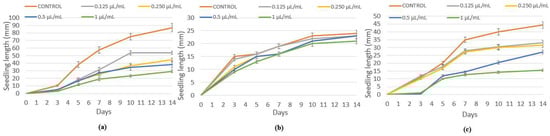 (a) L. multiflorum, (b) P. oleracea, and (c) E. crus-galli seedling growth. Control and treated with anise essential oil at 0.125, 0.25, 0.50, and 1 µL/mL.