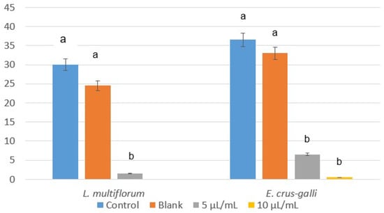Values of seed germination (%) of L. multiflorum and E. crus-galli control and blank, and treated with the emulsifiable concentrate of winter savory essential oil at 5 and 10 µL/mL. Means followed by different letters in each column indicate that they are significantly different at p < 0.05 according to T3 Dunnet and Tukey tests.