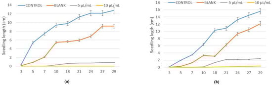 Hypocotyl growth (cm) of (a) L. multiflorum and (b) E. crus-galli control and blank, and treated with winter savory essential oil at 5 and 10 µL/mL.