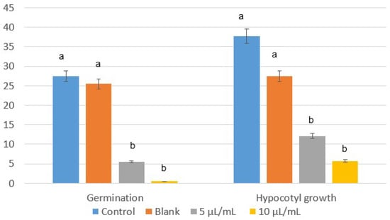 Despite L. multiflorum and E. crus-galli being more tolerant species in in vivo conditions, the emulsifiable concentrate of winter savory also significantly inhibited their seed germination, with percentages of 95–100% and 82–99% at 5 and 10 µL/mL, and without a significant effect with the blank (Figure 3). Similar results were found for hypocotyl growth (Figure 4), making the formulate with winter savory essential oil an ecological alternative to synthetic herbicides, which have already demonstrated a detrimental influence on the environment, crops, and human health.