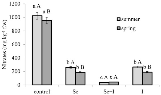 The most impacting phenomenon of B. juncea biofortification with Se and I was their strong effect on nitrate accumulation, the latter being 4 times lower under Se and I separate fortifications compared to control plants, but up to 27 times lower upon combined application of the two elements (Figure 1); notably, unlike the other treatments, the application of Se and I resulted in higher nitrate concentration in summer than in spring, which is consistent with the previous reports relevant to the light intensity direct effect on nitrate reductase activity [32]. The concentration of nitrates in plants seems to reflect the imbalance between absorption and assimilation rate. Interestingly, Se is known to stimulate NO3− assimilation by enhancing the activity of several enzymes, such as nitrate and nitrite reductases, glutamine synthetase and glutamate synthase [5]. The results provide direct evidence that exogenous Se shows positive function on decreasing NO3− accumulation via regulating the transport and enhancing activities of nitrogen metabolism enzyme. Selenium is strictly connected with nitrogen metabolism, by stimulating the amino acid biosynthesis and increasing the nitrate reductase activity [33]. In this respect, the selenate form supplied to potato [34], sunflower [35] and wheat [36] resulted in the increase of nitrate reductase activity and, accordingly, to a decrease of plant nitrate content. However, the effect of Se fortification on nitrate concentration may greatly vary depending on plant hormonal status [37].