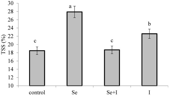 Water soluble compounds play a significant role in plant growth and development. Their content reportedly increases as a result of germination [8], suggesting the activation of strong hydrolysis and the consequent synthesis of biologically active compounds. Sugars are the main components of total soluble solids (TSS), playing an important role in carbohydrate metabolism, photosynthesis and production. Leafy vegetable crop plants not producing seeds or other parts that typically accumulate sugars, maintain these sugars in their stems, leaves and roots or employ them for growing up. The highest value of TSS was recorded in B. juncea leaves fortified with sodium selenate, with the level decreasing in the plants treated with potassium iodide and with no significant differences between control plants and plants of combined Se-I application (Figure 2). The results presented in Figure 2 are consistent with the growth-stimulating effect of Se and I application.
