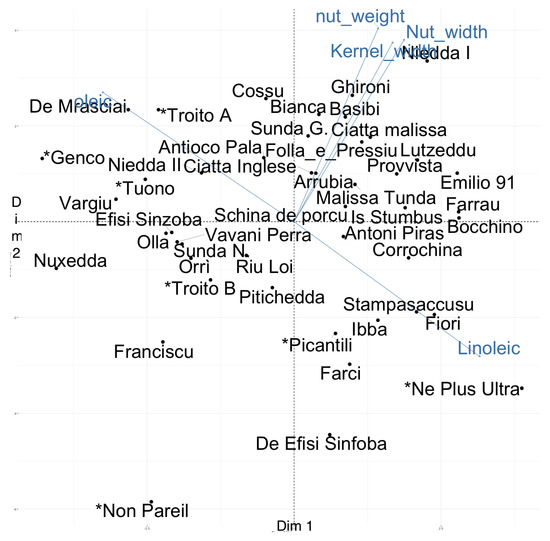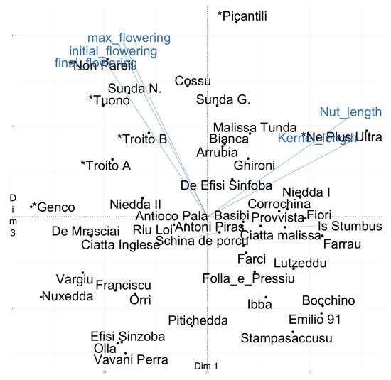 Most of the reference cultivars, such as Genco, Non Pareil, Tuono, Troito A, and Troito B, are all positioned on the left side of the PCA 1–2 biplot (Figure 1), mainly owing to their high oleic relative content. We found several Sardinian cultivars, such as Nuxedda, De Mrasciai, and Vargiu, which, due to the high compositional quality of their kernel oils, were positioned in close proximity to these reference cultivars along the first PCA. In particular, the cultivar Vargiu showed one of the highest oleic to linoleic content ratios and narrow nuts and kernels (see also Table 3 and Supplemental Table S1). It is noteworthy that the group composed of the cultivars Olla, Efisi Sinzoba, Vavani Perra, Sunda N., and Orri showed scores similar to that of the reference cultivar Troito B along PCA 1 and 2 (Figure 1). Since the flowering-related traits showed the highest contributions to the third PCA component, we summarized the combination of phenological and commercial traits by visualizing the scores in the third PCA along with those in first PCA component (Figure 2). The second component in the PCA accounted for % of the total variation, with high contributions for traits related to fruit characteristics: nut weight, nut width, and kernel width and, to a lesser extent, shelling percentage.