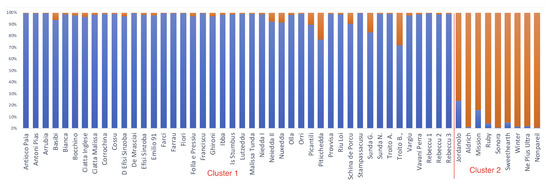 Most probable partition of cluster 1, as revealed by STRUCTURE analysis. Bars represent individuals, and coefficients of membership (Q) to specific clusters are reported with different colors. Cluster assignment was based on a membership threshold set at >0.75.