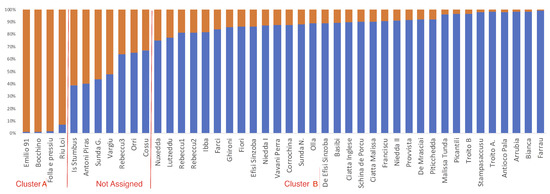 The cultivars Is Stumbus, Antoni Piras, Sunda G., Vargiu, Rebeccu 3, Orri, and Cossu were not assigned to any group, as none of their memberships reached the threshold for assignment (Q > ).