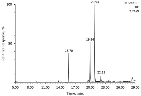 Chromatographic separation of FAMEs profile of crab apple Malus Bernu prieks oil using GC/MS: 15.70 min (palmitic acid), 19.96 min (oleic acid), 20.93 min (linoleic acid), and 22.11 min (α-linolenic acid).