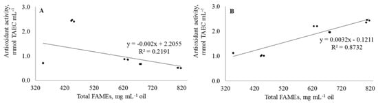 Correlation between total FAMEs (mg mL−1 oil) and the antioxidant activities (mmol TAEC mL−1) of tested apple pomace oils using: DPPH• assay (A); and FRAP assay (B).