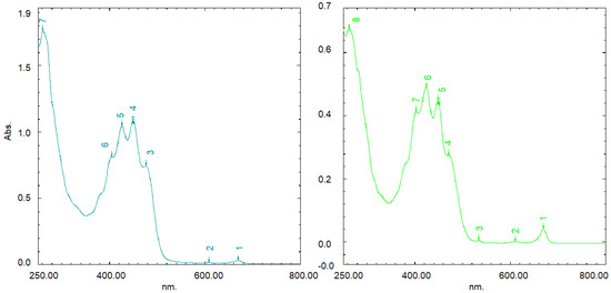 Total carotenoids were estimated using the method of Biehler et al. [53] As reported, the spectrophotometric method (method of mean) is robust with high reproducibility, sensitivity, and strong correlation with the HPLC method. The method is based on the mean absorption coefficients and mean absorption wavelength (Figure 4).