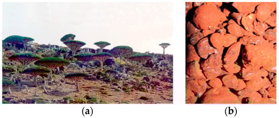 The ecological habitat (a) and the pure raw resin (b) of D. cinnabari in Soqotra Island (Author’s pictures 1990).