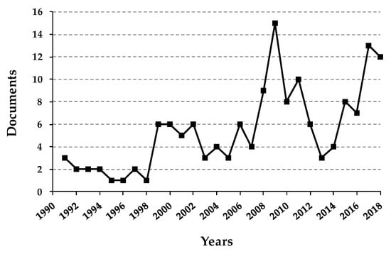 Documents regarding sea fennel published from 1991 to 2018. Documents by type: article (90.8%); conference paper (3.9%); review (3.3%); note (1.3%); book chapter (0.7%). Data retrieved from Scopus® database by using “Crithmum” AND “maritimum” as key terms for searching.