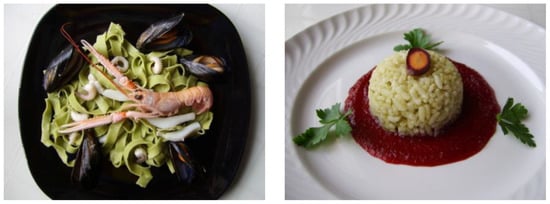 Currently, there is a niche market which offers fresh-cut sea fennel for a broad number of uses in the culinary field []. Being an aromatic herb, sea fennel may be used not only as a fresh product but also as a dried herb []. Renna and Gonnella [] reported the culinary use of the sea fennel as a new spice-colorant useful for several gastronomy products. According to these Authors, by using different types of dried sea fennel it is possible to obtain a broad range of applications in food; interesting flavor traits may primarily prevail in some cases, while a peculiar visual effect can be especially perceived in other cases. For example, in green tagliatelle (Figure 4), the main coloring effect of the freeze-dried sea fennel was highlighted, while in rice pilaf (Figure 4) with air-dried sea fennel the main spiced effect was reported as a primary trait [].