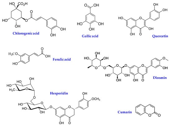 For example, Mekinić et al. [] reported that during April, sea fennel extract contained the highest amount of phenolics and chlorogenic acid in respect to other months. The presence of diosmin and hesperidin was reported by Cornara et al. [], while other Authors [] reported high amounts of caffeic, gallic, rosmarinic, vanillic, and p-coumaric acids as well as a small content of trans-cinnamic and trans-2-hydroxycinnamic acids. A low amount of apigenin, rutin, quercetin-3-galactoside, catechin, epicatechin, epigallocatechin is also reported [,]. Meot-Duros et al. [] reported the presence of falcarindiol in sea fennel leaves, while other Authors reported small amounts of some coumarins []. Figure 5 reports the chemical structure of some biologically active phenolic compounds found in sea fennel. Apart from phenolic compounds, other water-soluble compounds like sucrose, glucose and organic acids were reported [].
