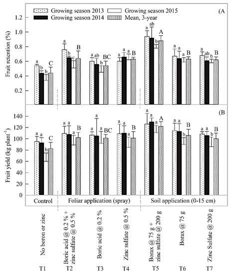All data were statistically analysed using Statistix® v 8.1 software (Tallahassee, FL 32317, USA). A repeated measure analysis of variance (ANOVA) was used to test the effects of foliar and soil B and Zn treatments on leaf mineral contents, fruit retention, fruit yield, and fruit quality variables. Since the same variables were quantified for 2013–15, the year was taken as fixed as well as a repeated measurement following Munir et al. [33]. Difference between treatment means was compared by Tukey’s significance difference test at p ≤ 0.05.