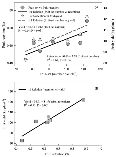 (A) Relationship between fruit-set number per panicle and fruit retention (%), and fruit yield (kg plant−1). Each point shows mean (n = 7) values. (B) Relationship between fruit retention percentage and fruit yield per plant. Each point shows means (n = 7) of fruit retention percentage, and fruit yield per plant. Every correlation showed significant at p < 0.05.