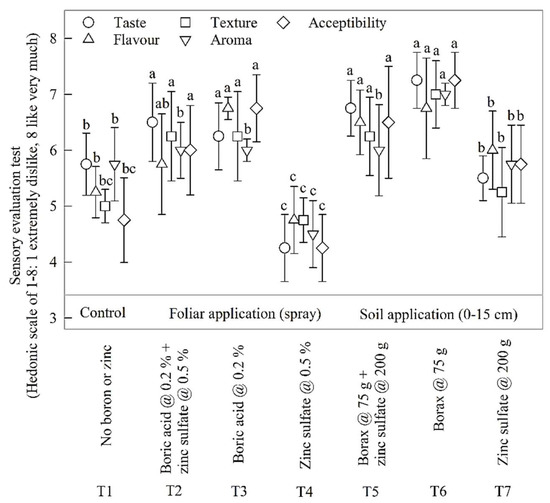 The sensory evaluation data of organoleptic parameters were subjected to rank correlation (Figure 3). There was an overall positive, between-parameters rank correlation across all treatments. Significant differences were also found between individual parameter ranks among all treatments, with the highest ranks in response to soil B application and the lowest fruit quality traits in response to 0.5% zinc sulfate foliar application in comparison to control. It is quite interesting that the same foliar application (0.5% zinc sulfate) led to an increase in fruit retention and yield in comparison to control (Table 1).