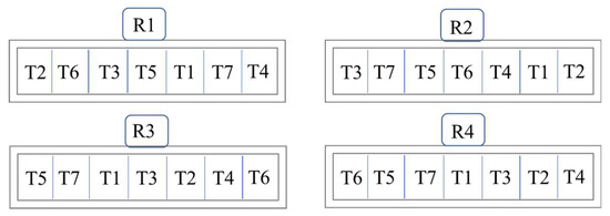 The experimental design was a randomized complete block, with seven treatments (T) and four replications (R) per treatment, and the experimental unit was a tree (Figure 4). Twenty-eight 20-year-old Chaunsa (cv. white) mango trees, equivalent in size and uniform in vigour, were selected in 2012 to study the effects of foliar and soil B and Zn applications on leaf mineral contents and fruit retention, yield, and quality traits. The trees were growing on soils with similar soil quality index [28] (data not provided) and were maintained using standard orchard management practices of irrigation, pruning, and weeding [29]. A balanced NPK basal dose (1000 g year−1) from urea (CO (NH2)2), single superphosphate (Ca (H2PO4)2 and potassium sulfate (K2SO4) sources, respectively, were applied to each tree: a full P (1000 g) and a one-half (500 g) each of the N and K mineral nutrients were mixed with topsoil under the canopy after fruit harvest (end of July 2012), and the remaining N and K were applied before flowering (start of February 2013). At the pre-flowering stage, foliar sprays or soil applications of Zn and B were also completed every year according to the following treatments and graphical scheme (Figure 4):