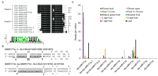 To identify sly-miR171 sites of activity in tomato, analysis of public small RNAseq data at TFGD was performed. This analysis revealed that sly-miR171a, sly-miR171b, iso-sly-miR171d, and sly-miR171e are the most abundant members in the family, but the expression of each is prominent in a distinct tissue or developmental stage: sly-miR171a—leaves, floral buds and anthesis flowers, sly-miR171b—immature green fruit, iso-sly-miR171d—anthesis flowers and sly-miR171e—leaves, mature and ripening fruit (Figure 1C). Hence, the sly-miR171 family functions in vegetative as well as reproductive tissues with possible functional diversification between different members.