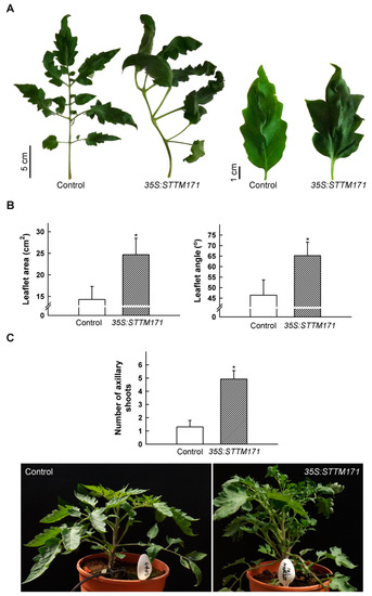 During vegetative development the compound leaves of 35S:STTM171-17 plants developed primary leaflets that frequently had a distorted growth angle, were larger and their lobes were deeper than that of the control, implicating sly-miR171 in compound leaf morphogenesis (Figure 3A,B). In addition, compared to control plants, the number of axillary shoots was significantly higher in the 35S:STTM171 plants (Figure 3C). This phenotype is consistent with the increased lateral branch number observed in transgenic tomato plants that ectopically expressed SlHAM2/SlGRAS24, which was upregulated in 35S:STTM171 leaves (Figure 2C), and with transgenic Arabidopsis that ectopically expressed the ath-miR171c-ressitant versions of SCL6-II/HAM1, SCL6-III/HAM2, and SCL6-IV/HAM4 [24,25]. Both SlHAM and SlHAM2 are abundant in vegetative and reproductive meristems and function in their maintenance [6]. Thus, sly-miR171 may suppress lateral branching by the negative regulation of the expression of SlHAM2 and apparently also SlHAM in axillary meristems.