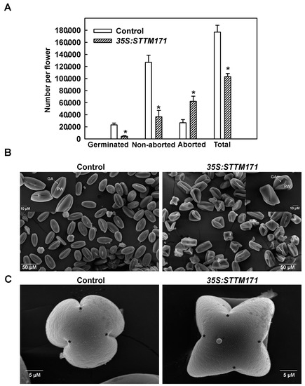 Whereas tapetum is still intact at the tetrad stage, its cells export sporopollenin on microspore primexine surface that will provide a basis for future assembling of lipid materials into the pollen coat exine. During this process and earlier meiosis, the PMC and tetrads are surrounded by callose layer that provides protection for developing microspores. Later, the callose layer goes through degradation by tapetum supplied callase and the tapetum goes through PCD aiming to supply additional materials to the microspores [32,33,34]. The degradation of callose allows microspore release from tetrads and degradation of the tapetum supplies lipidic tapetum-derived materials for pollen exine and nutrients for pollen maturation [33,34]. The timing of tapetal cell death and consistency of the above-described events are critical for pollen development and interference in this process usually results in male sterility [35]. In several studies, delaying tapetum degeneration was shown to affect pollen morphology and results in pollen abortion. The rice mutant tapetal degeneration retardation (Ostdr) shows delayed tapetal breakdown resulting in a failure of pollen wall deposition and subsequent microspore degeneration [36]. Mutation in rice OsACOS12 delays PCD-induced tapetum degradation leading to collapsed aborted pollen [37]. Thus, a likely possibility is that the delayed degeneration of STTM171 expressing tapetum may be responsible at least in part for the deformed morphology of respective pollen grains.