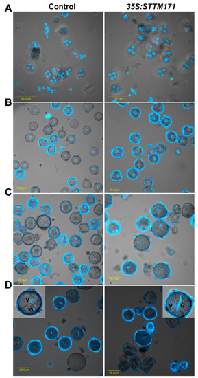 The 35:STTM171 pollen grains contain normal germ unit. DAPI fluorescence micrographs of control and 35:STTM171 tetrads (A), microspores (B), binucleate microspore (C), mature pollen grains (D). Inset in (D) shows magnified view of a representative pollen grain. The vegetative (V) and generative (G) cells are indicated. Note that the pollen surface fluorescence is due to auto-fluorescence at the same wavelength used for DAPI detection.