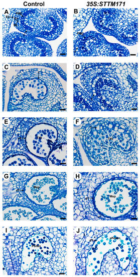 Next, we asked whether the reduced accumulation of sly-miR171 in 35S:STTM171 anthers is associated with abnormal development of anther tissues. To answer that, control and 35S:STTM171 anthers at major developmental stages were comparatively examined using transverse section light microscopy. Following examination of anthers under light microscopy showed that at the microsporocyte stage (3 mm buds, stage 8) the control pollen mother cells (PMC) are enclosed by a single layered tapetum (Figure 6A). At this stage, no distinct differences between control and the 35S:STTM171 transgenic anthers were observed (Figure 6B). Morphological differences were initially observed at the meiosis stage (4 mm bud, stage 9, Figure 6C). At that stage the control tapetal layer, which is composed from condensed tapetum cells, as indicated by their shrinkage and deep staining, encloses dividing microsporocytes, whereas in 35S:STTM171 anthers, tapetal cells remain expanded and vacuolated and dividing microsporocytes were not observed (Figure 6D). At the tetrad stage control tapetal cells were completely shrunk (5 mm bud, stage 11, Figure 6E), likely due to the initiation of programmed cell death (PCD) [31], and enclosed separated tetrads. In contrast, in 35S:STTM171 anthers, tapetal cells were not shrunken and instead were enlarged while most tetrads were not separated (Figure 6F). At the microspore stage, degenerated tapetal layer enclosing free microspores was observed in both control (8 mm bud, stages 12–13, Figure 6G) and 35S:STTM171 anthers (Figure 6H), except that in the latter the tapetum was less degenerated. At the bicellular pollen stage the control tapetum was completely degenerated and pollens were mature with characteristic densely stained cytoplasm (10 mm bud, stage 17–18, Figure 6I), whereas in 35S:STTM171 anthers, remnants of the degenerated tapetum were still visible and enclosed aborted pollen (Figure 6J). These observations indicated that the degeneration of the tapetum in the anthers silenced for sly-miR171 was delayed and initiated only after the tetrad stage in comparison to control where tapetum degradation occurred significantly earlier and on time.
