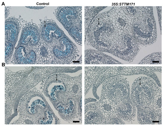 Callose detection in control and 35S:STTM171 anthers. Pictures of Lacmoid stained cross sections of anthers at the meiosis (A, 4 mm bud) and tetrad (B, 5 mm bud) stages are shown. T-tapetum. Scale bars = 20 μm.