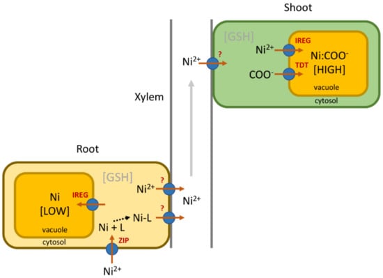 A general model for nickel hyperaccumulation in plants. Enhanced uptake of the Ni2+ cation from soil may be driven by high constitutive expression of poorly selective ZRT-IRT-like (ZIP) transporters responsible for Fe or Zn uptake. Chelation of Ni by an appropriate ligand (L) in the root cytosol is thought to prevent cytotoxicity. The identity and universality of the ligands used are an ongoing topic of debate, but histidine or nicotianamine perform this role in some Brassicaceae Ni hyperaccumulators. Formation of a Ni-ligand (Ni-L) complex may also impede the vacuolar sequestration of Ni in root tissues by tonoplast localized iron-regulated/ferroportin (IREG/FPN) transporters. Whether Ni is loaded into the xylem as the free cation or as a Ni-ligand complex is unclear, and the transporter(s) involved have not been identified, but the majority of Ni is present as the free cation in xylem sap. The transporter(s) involved in xylem unloading into shoot cells is also unknown. Ni is accumulated primarily in the shoot epidermis in most species, with the vacuole the major subcellular site of Ni sequestration. Constitutively high expression of IREG/FPN transporters has been reported in Ni hyperaccumulators versus related non-accumulators across four families, and two of these transporters have been shown to drive vacuolar sequestration of Ni. In the vacuole Ni is complexed by carboxylic acids (COO−), with Ni-citrate or Ni-malate the predominant complexes identified to date. Ni hyperaccumulating Senecio coronatus plants display greatly increased expression of the tonoplast dicarboxylate transporter (TDT) compared to non-accumulators. Ni hyperaccumulators have enhanced capacity for the detoxification of reactive oxygen species, which may involve elevated concentrations of glutathione (GSH), flavonoids or increased activities of anti-oxidant enzymes.