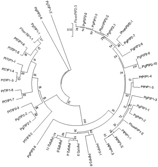 The root cDNA was used as a template to clone predicted aquaporin genes from Pinus contorta using the primers listed in Supplementary Tables S4 and S5. The clones contained open reading frames with a 3-UTR. Five predicted aquaporin genes were cloned from P. contorta roots. A BLAST search against the NCBI database revealed that there were three PIP2, one PIP1, and one TIP1 aquaporins. The deduced protein sequence of P. contorta PIP2s, PIP1, and TIP1 contained 282, 288, and 253 amino acid residues, respectively. The aquaporin genes identified from P. contorta were systematically named according to the phylogenetic relationship with the documented aquaporins in Populus trichocarpa [43] and Picea glauca [44] (Figure 1). Based on the closest Populus aquaporin names, P. contorta (Picon) aquaporin genes were named as follows: PiconPIP1;2, PiconPIP2;1, PiconPIP2;2, PiconPIP2;3, and PiconTIP1;1.