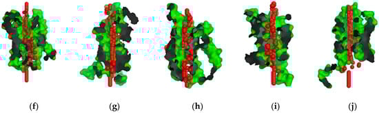 Pore diameter profile (a–e) of five Pinus contorta aquaporins: (a) PiconPIP2;1; (b) PiconPIP2;2; (c) PiconPIP2;3; (d) PiconTIP1;1; and (e) PiconPIP1;2 at 3A steps obtained from PoreWalker software. The red arrow indicates the approximate location of the ar/R filter and the green arrow corresponds to the NPA sites. The cavity features in the XZ-planar section (f–j) of five PiconAQPs: (f) PiconPIP2,1; (g) PiconPIP2;2; (h) PiconPIP2;3; (i) PiconPIP1;2; and (j) PiconTIP1;1 for Y < 0, coordinates only. Red spheres indicate pore centers at 1A step along the pore axis.