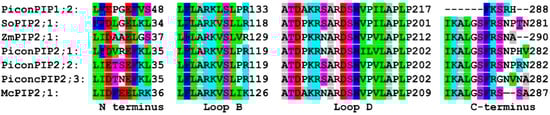The conserved amino acid residues that were predicted to be involved in water channel regulation in PiconAQPs are shown in Figure 3. A conserved glutamic acid residue was located in PiconPIP2s at Glu32 and in PiconPIP1;2 at Glu45 (corresponds to Glu31 in SoPIP2;1; Glu34 in ZmPIP2;1, and Glu33 inMcPIP2;1). In loop B, a conserved serine residue was located at Ser116 in PiconPIP2s and at Ser130 in PiconPIP1;2 (corresponds to Ser115 in SoPIP2;1; Ser126 in ZmPIP2;1, and Ser123 in McPIP2;1). A conserved histidine residue in loop D was located at His208 in PiconPIP1;2 and at His194 in PiconPIP2s (corresponds to His193 in SoPIP2;1; His204 in ZmPIP2;1, and His201 in McPIP2;1). Identification of these conserved residues will be helpful in revealing the role of PiconAQPs in stress resistance by conducting in vitro functional assays.
