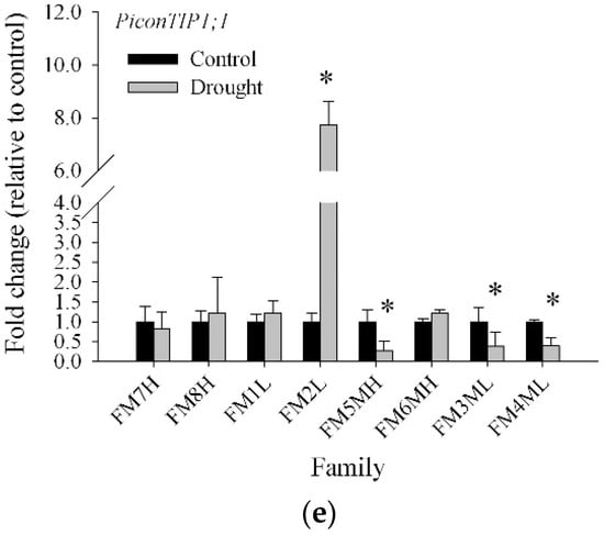Relative mRNA levels of five aquaporin genes of eight families in Pinus contorta roots (expressed as fold change from control) (a) PiconPIP2;1; (b) PiconPIP2;2; (c) PiconPIP2;3; (d) PiconPIP1;2; and (e) PiconTIP1;1. Values are for control and drought-stressed plants. Mean values with the asterisks indicate significantly different at p ≤ 0.05. Error bars on each column indicate the standard deviation from four biological (seedling) replicates.