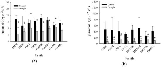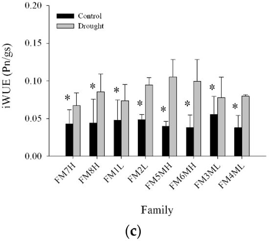 (a) Net photosynthesis (Pn), (b) stomatal conductance (gs) of needles, and (c) intrinsic water use efficiency (iWUE = Pn/gs) from eight Pinus contorta families under greenhouse conditions at 63 days after drought treatment initiation (63DAT). Values are means plus the standard deviation with four biological replications. Mean values with the asterisks indicate a significant difference at p ≤ 0.05.
