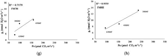 Relation between net photosynthesis (Pn) and stomatal conductance (gs) for eight lodgepole pine families over 63 days of drought stress. The data points represent days after drought treatment initiation (DAT) at 28DAT, 45DAT, and 63DAT: (a) FM1L; (b) FM2L; (c) FM3ML; (d) FM4ML; (e) FM5MH; (f) FM6MH; (g) FM7H; and (h) FM8H.