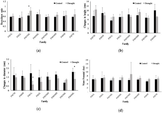 (a) Root:shoot ratios of dry biomass, (b) changes in height, and (c) changes in root collar diameter of eight Pinus contorta families exposed to two watering treatments: well-watered controls and drought. Values are means plus the standard deviation with four biological replications. Mean values with the asterisks indicate significant difference at p ≤ 0.05. (d) Plant water potential (bars + SD; n = 4) at 63DAT just prior to harvesting for control and drought treated Pinus contorta seedlings.