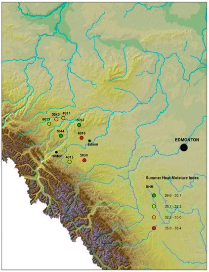 Source sites of Pinus contorta families from the eastern slopes of central Alberta Rocky Mountains (Canada; Region A Pinus contorta Controlled Parentage (tree improvement) Program (CPP) used in this study. ArcGIS 10.5 GIS was used to create the site map. The map shows the unique identifier number of P. contorta families and summer heat:moisture index (SH:M) of the region.