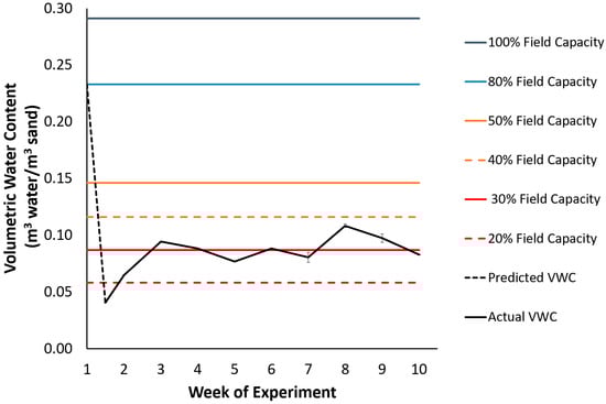 Volumetric water content (m3 water/ m3 sand) of the drought treatment during the period of drought treatment in the experiment, as measured with a theta moisture probe.