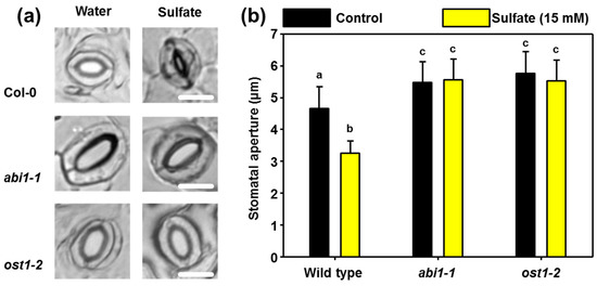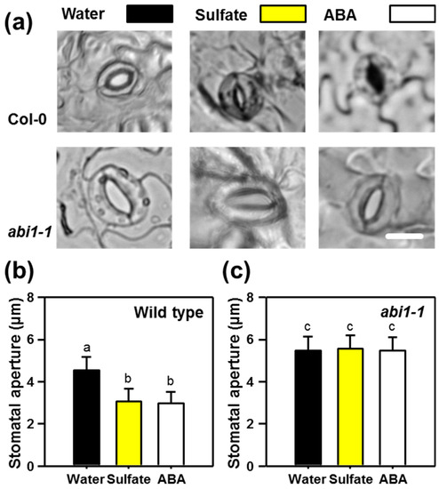 In a separate experiment, we independently confirmed the absence of sulfate responsiveness for abi1-1 and applied ABA as a control for stomatal closure. Treatment of sulfate (15 mM) and ABA (50 µM) resulted in significant stomatal closure in the wild-type. The degree of stomatal closure was indistinguishable after sulfate and ABA application. ABA or sulfate application to epidermal peels of the abi1-1 mutant did not affect the stomatal aperture (Figure 2).