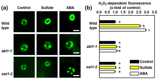 A known target of the ABI1-OST1 phosphorylation relay is the membrane resident NADPH oxidase RBOHF, which is essential for ABA-induced ROS production [4]. We, therefore, tested the formation of ROS in guard cells after sulfate-application to epidermal peels from the wild-type, the abi1-1, and the ost1-2 mutant. Application of sulfate (15 mM) resulted in significant production of ROS in the wild type. The degree of ROS formation in response to sulfate was comparable to the formation of ROS after application of 50 µM ABA (Figure 3a,b). The guard cells in epidermal peels of abi1-1 and ost1-2 displayed wild-type like levels of ROS under control conditions. Both mutants of the ABI1-OST1 phosphorylation relay failed to produce ROS in response to the application of sulfate, which is in concordance with the failure to close stomata in response to sulfate. Also, ABA application did not induce ROS formation in both mutants under their applied conditions, which is in agreement with results of previous studies [5].