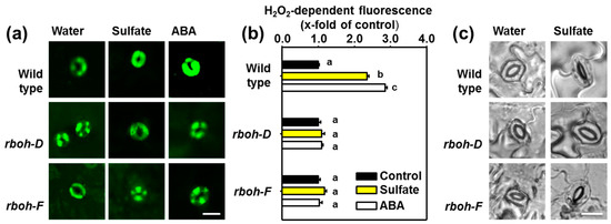 In order to link the activation of OST1 and the formation of ROS upon sulfate stimulus with the membrane resident NADPH oxidases, we tested the contribution of two major isoforms of RBOHs expressed in guard cells, RBOH-D and RBOH-F, to sulfate-induced ROS formation [42]. The rboh-D and rboh-F mutant lack functional isoforms of the NADPH oxidase due to a T-DNA insertion in the respective gene. The absence of either RBOH-D or RBOH-F impaired ROS formation in guard cells upon application of ABA or sulfate for three hours to epidermal peels (Figure 4a,b). Consequently, sulfate did not affect stomatal aperture in both mutants (Figure 4c). Wild-type guard cells produced ROS and closed stomata upon sulfate application.