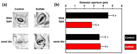 The volatile signal H2S is a downstream product of sulfate assimilation and has been shown independently to induce stomatal closure [34,43,44]. Since sulfate must be incorporated into cysteine to gain competence as an inducer of stomatal closure, we decided to test if sulfide is also incorporated into cysteine for induction of ABA biosynthesis. Sulfide is the direct sulfur-precursor of cysteine and is incorporated by the activity of OAS-TL into cysteine. Cysteine biosynthesis is not limited by OAS-TL activity, but by the formation of the carbon skeleton for cysteine, OAS. The three major SERAT isoforms SERAT1;1, SERAT2;1 and SERAT2;2 produce the bulk of OAS for the incorporation of sulfide into cysteine in the cytosol, the plastids, and the mitochondria. A SERAT triple knock-out mutant (serat tko) lacking these major SERAT isoforms is retarded in growth and displays significantly lowered translation due to decreased production of OAS and cysteine [45]. When we applied 100 µM sulfide (NaHS) dissolved in water at pH 5.5 to epidermal peels of the wild-type, the dissolved sulfide triggered the closure of the wild-type stomata within 90 min. The application of water at pH 5.5 for the same duration did not affect the stomatal aperture (Figure 5). Remarkably, sulfide failed to close the stomata in epidermal peels of the serat tko mutant. These results suggest that sulfide is not perceived by a membrane-resident receptor located at the plasma membrane, but is incorporated into cysteine to gain competence as a stomatal closure signal.