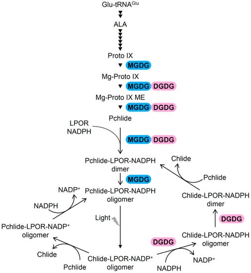 Involvements of galactolipids in Pchlide biosynthesis, the organization of Pchlide–LPOR–NADPH complexes and the regeneration of photoactive ternary complexes after photoconversion. The pathways for Chlide biosynthesis and the conversion of (P)chlide–LPOR complexes are shown with important intermediates. An involvement of MGDG and/or DGDG is indicated by their names with the corresponding steps. Both galactolipids facilitate the membrane-associated processes of the Pchlide biosynthesis pathway and the formation of the Pchlide–LPOR–NADPH ternary complex. In addition, MGDG plays a role in the oligomerization of the ternary complex, whereas DGDG is required for the modification of the complex after photoconversion.