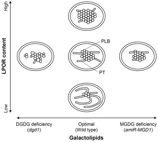 In addition to proteins and pigments, glycerolipids are essential components of internal membranes of etioplasts and chloroplasts. The composition of glycerolipids is similar between PLBs and the thylakoid membrane (Figure 1A), despite the large differences in their structures. In both PLBs in etioplasts [] and the thylakoid membrane in chloroplasts [], MGDG and DGDG account for ~50% and ~30%, respectively, of total membrane lipids. PTs have a relatively lower MGDG-to-DGDG ratio (1.1) than PLBs (1.6) in wheat etioplasts [].