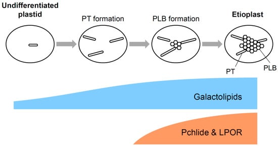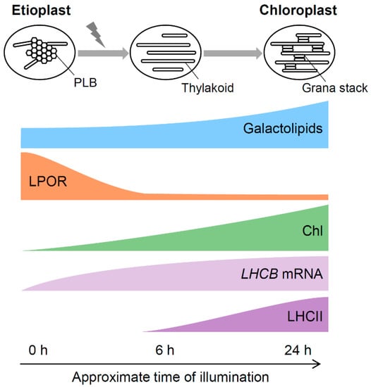 Etioplasts largely differ from chloroplasts, particularly in structures and components of internal membranes. Unlike chloroplasts with highly stacked lamellar thylakoid membranes, etioplasts form paracrystalline, three-dimensional lattice structures named prolamellar bodies (PLBs), from which flattened lamellar prothylakoids (PTs) are radiated []. Etioplasts accumulate protochlorophyllide (Pchlide), the precursor of chlorophyll (Chl), in these internal membranes. With light exposure, etioplasts rapidly differentiate to chloroplasts to establish photoautotrophic growth. The differentiation from etioplasts to chloroplasts after light exposure involves the dynamic transformation of PLBs to thylakoids, which is accompanied by changes in pigment compositions from Pchlide to Chl and accumulation of other photosynthetic components including photosystem (PS) I, PSII, and light-harvesting complex (LHC).