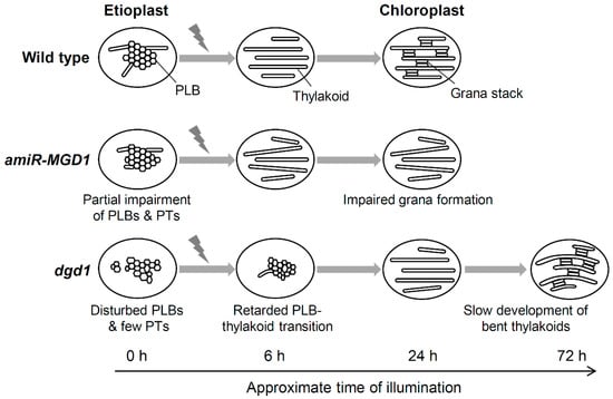 Upon light exposure, tubular PLBs were directly converted to the lamellar thylakoid membrane []. The regular structure of PLBs is rapidly lost in 1–4 h of illumination and transformed into flat slats. Subsequently, stacked membranes appear in the first day of illumination, followed by the development of the grana stacks connected to unstacked stroma lamellae in the next few days. Despite the rapid and dynamic transformation of the internal membrane systems during the etioplast-to-chloroplast differentiation, galactolipid content only gradually increases during the greening process. The content of both MGDG and DGDG was almost unchanged during the first 6 h of illumination in Arabidopsis [] and cucumber []. Etiolated barley seedlings even showed a decrease in galactolipid content at the beginning of greening []. Then the barley seedlings increased the lipid content after 6 h, which coincided with the grana formation. In etiolated seedlings of cucumber and Arabidopsis, the galactolipid content increased to ~4 fold and 2–3 fold, respectively, after 24 h of illumination [,]. Therefore, in these plants, PLB is transformed into the early thylakoid membrane without an increase in galactolipid content, presumably by diverting lipid constituents from PLBs to thylakoid membranes directly.