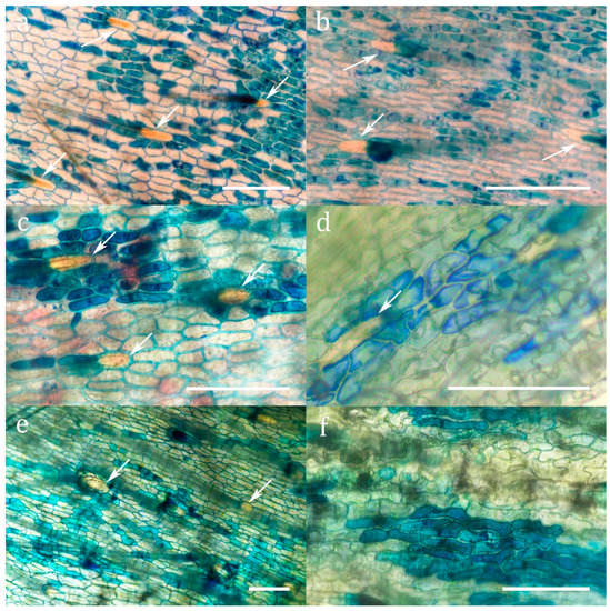 Methylene blue staining of cuticular pores in the absorptive zone (a) Sarracenia alabamensis (b) Sarracenia leucophylla (c) Sarracenia minor (d) Sarracenia oreophila (e) Darlingtonia californica (f) Sarracenia psittacina. Arrows indicate trichoblasts. Scale bar: 100 µm.