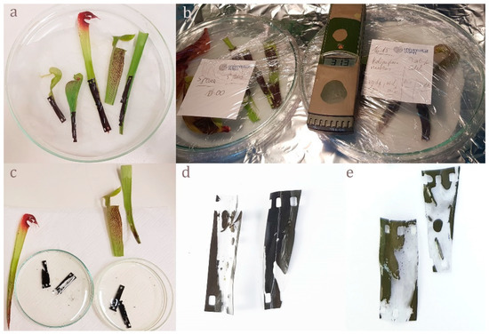 Enzyme test for proteases; (a) preparing Darlingtonia californica, Sarracenia psittacina, Sarracenia minor, and Sarracenia alabamensis for the enzyme test by attaching little pieces of film wetted with BSA onto the absorptive zones of the pitchers; (b) incubation in wet chambers for 18–48 h; (c) developing of the film pieces in a film developer; (d) positive enzyme test for S. minor; (e) positive enzyme test for Darlingtonia californica.
