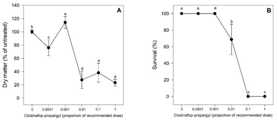4.2. Experiment 1. Determination of the Minimum Dose of Herbicide That Produces Changes to Plants’ Metabolism